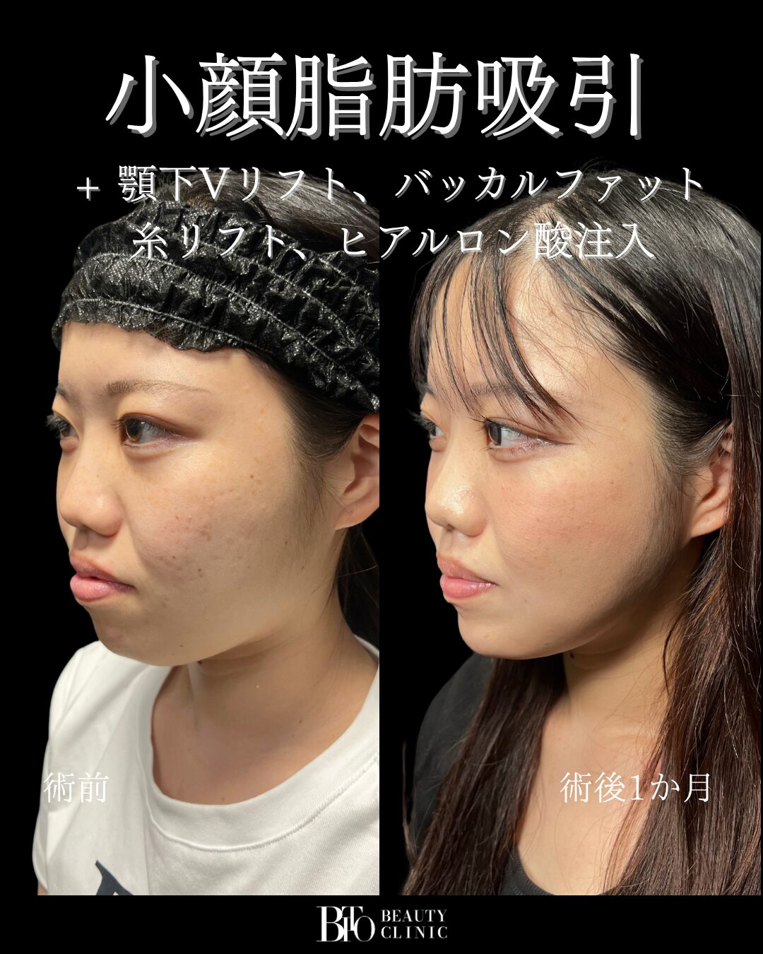 口元の皮下にある脂肪に対し、口角または外側から小切開または極細カニューレによる脂肪吸引で処理します。場合により局所麻酔のみで対応可能です。