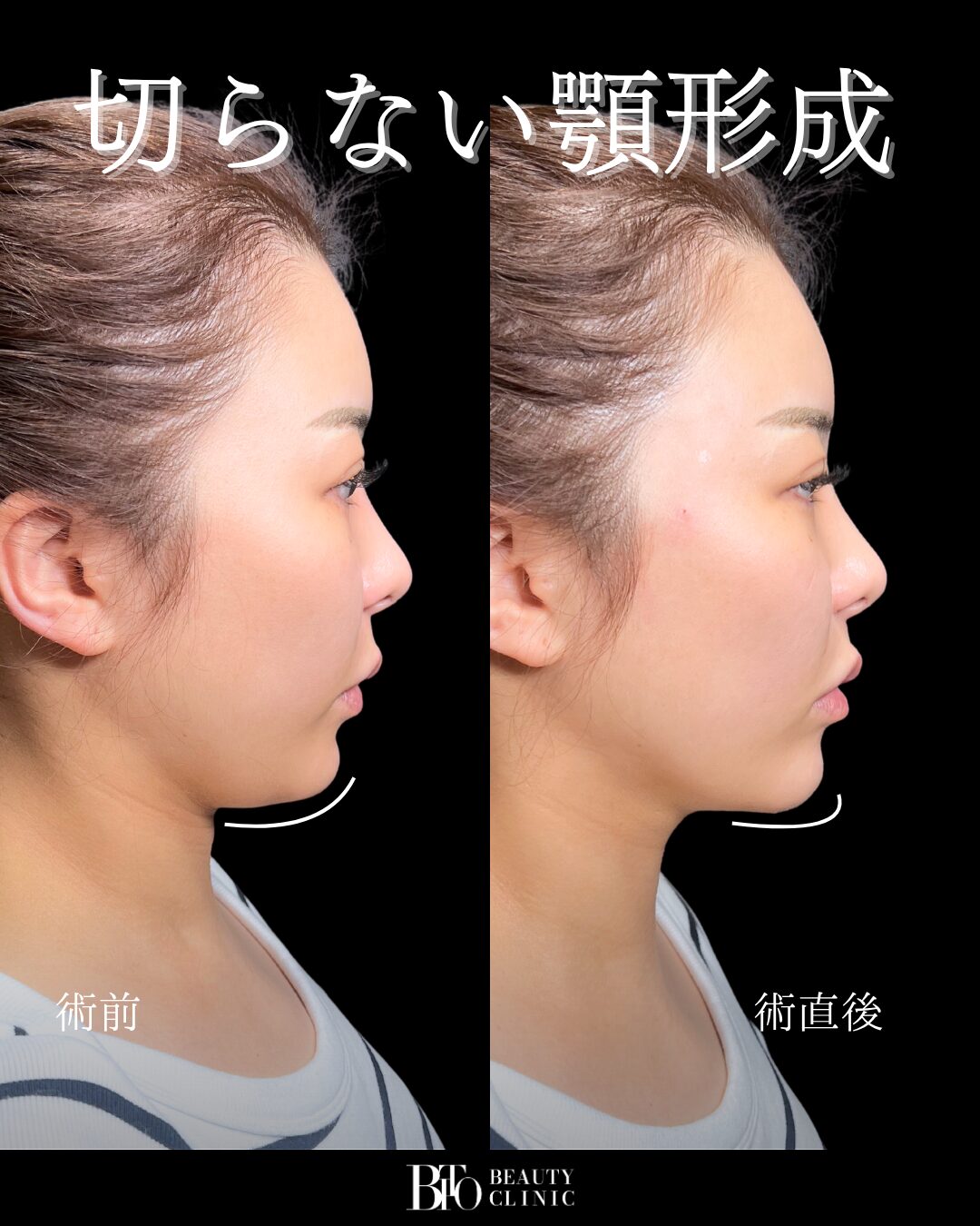 従来のあご形成ではヒアルロン酸注入やプロテーゼによるボリューム追加が主流でしたが、本治療では引き出す構造的アプローチにより、過度な厚みを出さずに立体的な輪郭形成が可能です。溶けない糸による長期固定により、効果は半永久的に持続します。
