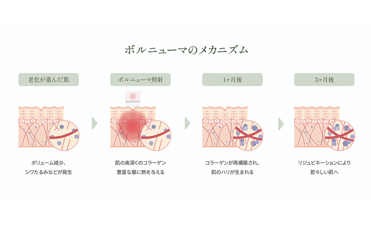 ボルニューマは、単極(モノポーラ)高周波を用いた機器で、肌表面から真皮・皮下組織まで広範囲かつ深く熱を届けることが可能です。これにより、コラーゲンやエラスチンの産生が活性化し、内側からふっくらとしたハリ・引き締め感が生まれます。 表層のみに作用する治療とは異なり、たるみの土台そのものに働きかけることで、より確かな効果と持続性が期待できます。